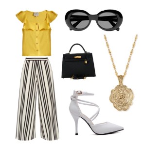 Chances are, at one point or another, you bought a pair of plain, black sunglasses, and now their either your favorite pair, or, lying around your house somewhere, neglected. It’s time to bring them back to the forefront of your wardrobe. Black glasses are a classic staple, and they are way too fun to style. Wear them with bold colors, like the yellow above, and fun patterns, like these striped pants.