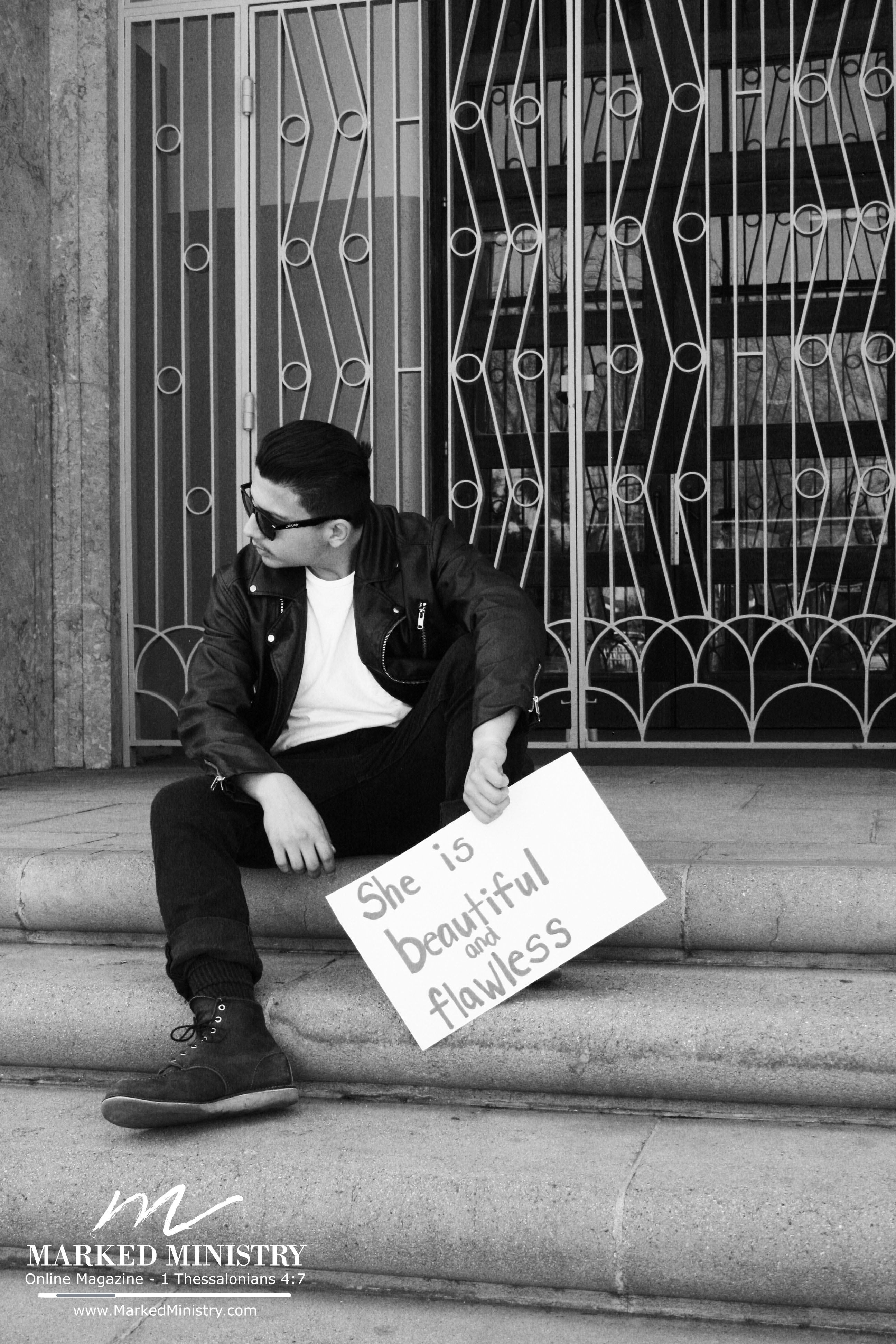 Here at Marked Ministry, we want to honor women like Jesus did and continues to do by reflecting on His words to women. It was important for us to deliver them to you by a guy who loves God. Our model, Harley, loved the message and was excited to be apart of our issue sharing this message. Each statement was prayed about and given consideration as we desired to create statements that reflected the heart of Jesus. In the process, we thought it would be fun to come up with a concept that captured some of the personality and style of our model, giving a retro black and white feel. Inspired by his wardrobe, we coupled classic with cool because we believe godly guys have style! But, we also believe the true definition of “cool” comes from Jesus, who wasn’t afraid to stand up for women and show them honor. We pray Harley isn’t the first or the last in this movement. May you be inspired to do the same.