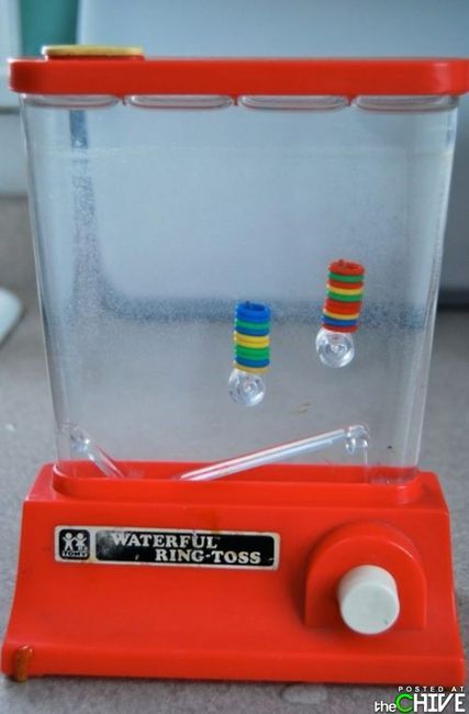 This toy was a fun but challenging game. It was typically a clear box with two ‘sticks’ on the left and right side. It was also filled with some clear liquid and red and blue circles. The objective is to get all the circles on to the two sticks by pushing two buttons on either side of the box. By pushing the buttons, it pushes air towards where the circles are, and moves them to the sticks.